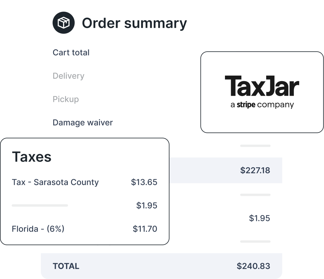 Whether you're charging tax on tools, equipment, or accessories, Quipli uses TaxJar’s database of U.S. tax jurisdictions to pull in the right rates - reducing errors and manual work.