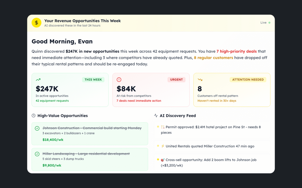 Quinn learns your fleet, your customers, your territory, and your rental patterns, then thinks like your best rep. It operates with 360-degree intelligence across your phone, SMS, and email, monitoring every revenue signal across your entire operation. Every call, email, voicemail, and text is analyzed for job mentions, upcoming projects, equipment needs, and competitor threats.